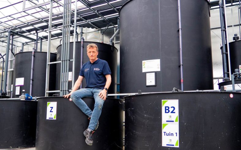 Aan de linkerkant, grenzend aan de kas, staan de drie mengbakunits. Elke tuin heeft een aparte aansturing. Hier wordt het water uit de drains gemengd met hemelwater en meststoffen, zuur of loog. Biersteker maakt dit zichtbaar als hij wijst naar vier verschillende transparante leidingen. Hij verklaart: “In het begin van de teelt heb je nog weinig drain. De oplossing is dan te zuur en daarom voegen we loog bij. Later in de teelt is het te basisch en moet je zuur bijvoegen.”