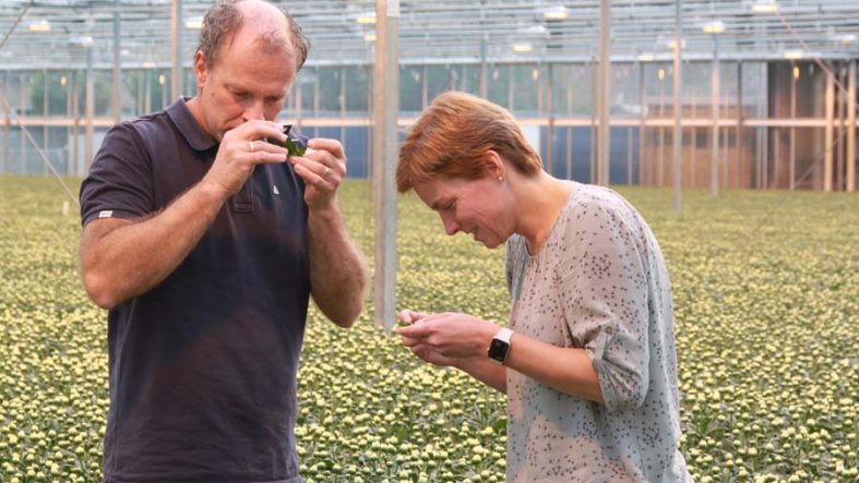 Het principe ‘less is more’ lijkt de broers René en André er op het lijf geschreven. Dat geldt ook voor de gewasbescherming. “We spuiten zo min mogelijk, al blijft schoon beginnen en schoon eindigen een must in chrysanten”, zegt René. “In de tussenliggende weken houden biologische bestrijders en groene middelen de plagen onder de duim. Chemisch corrigeren is dan meestal niet nodig.”