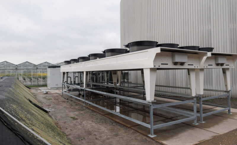 De warmtepomp, met een vermogen van 1 MW, draait op elektriciteit die de ondernemers inkopen van het net. “We zetten de warmtepomp in op momenten dat de stroomprijzen gunstig zijn. Is elektriciteit te duur en onze warmtebuffer leeg, dan zetten we de gasketel aan. Naar de toekomst toe zal de warmtepomp waarschijnlijk vaker gaan draaien, aangezien de inzet van gas steeds duurder wordt.”