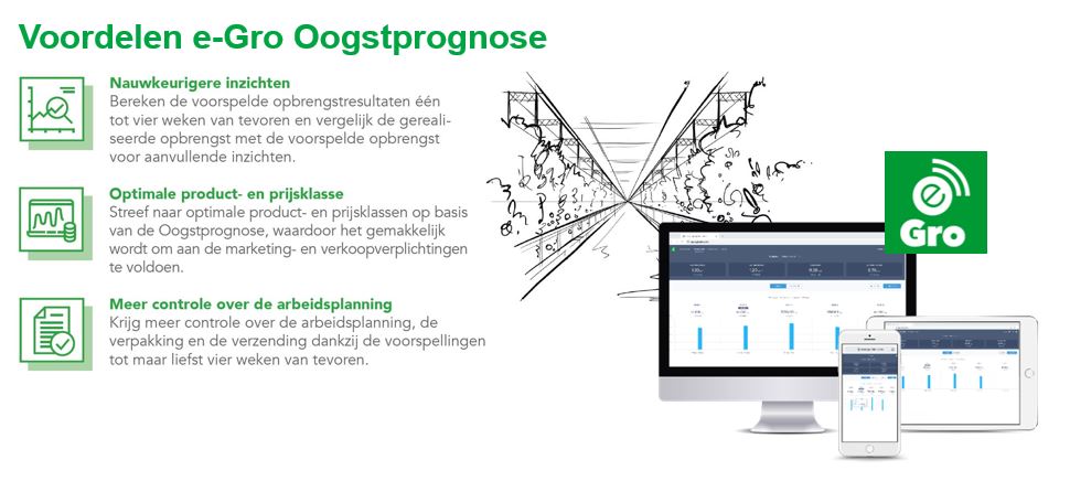 e-Gro’s Oogstprognose maakt een nauwkeurige oogstvoorspelling op basis van historische data in het programma. Met de slimme algoritmes berekent het programma een oogstvoorspelling voor de komende vier weken. Met deze slimme inzichten kan een teler tijdig anticiperen met het maken van nieuwe (teelt) beslissingen in de kas. Lees via deze link meer over hoe een e-Gro gebruiker het ervaart om met e-Gro oogstprognose model te werken.
