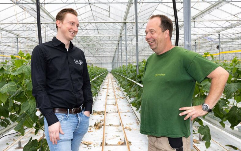 Door gaten te prikken wist de komkommerteler van Oxin Growers het foliescherm twee weken langer te gebruiken. “Daar heb je maar even profijt van. Dan voelt die plant: het klimaat wordt droger en gaat dan meer wortels maken en verdampen. Planten gaan het verschil dan zelf aanvullen.”