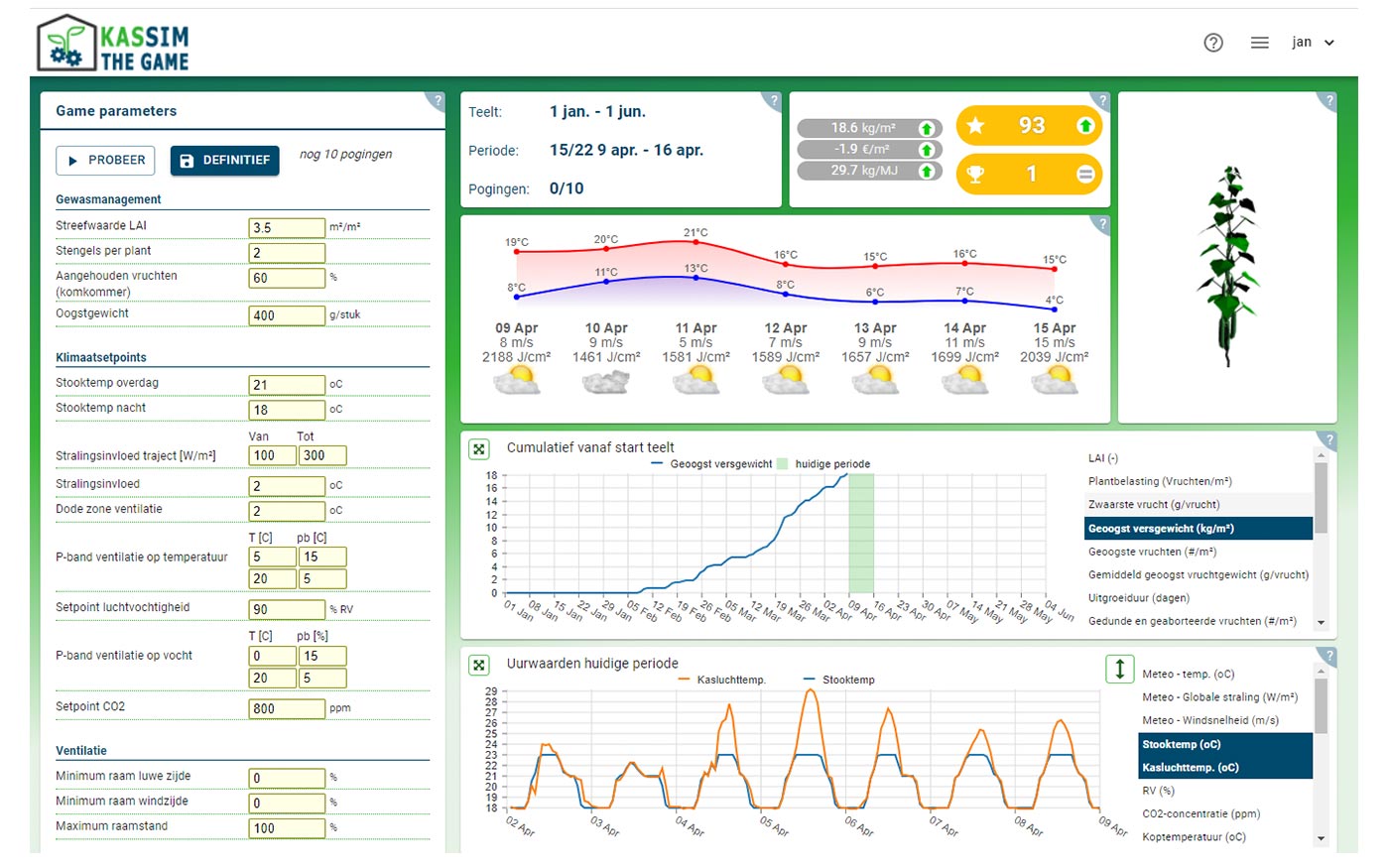 ‘Kassim the Game’ is ontwikkeld door Wageningen University & Research. “Het is een vrij realistisch en uitdagend spel, dat goed aansluit op de belevingswereld van studenten uit het groene onderwijs”, zegt game-ontwikkelaar Gert-Jan Swinkels. “Na registratie op de game, die door een docent is aangemaakt, kunnen de deelnemers naar eigen inzicht en in eigen tempo in een virtuele setting komkommers gaan telen. Ze kiezen eenmalig zaken zoals glastype, schermen en belichting en gaan daarna in stappen door de teelt. Daarbij kunnen de setpoints voor onder andere klimaat, belichting en schermstrategie tussentijds worden aangepast. De deelnemers moeten ook keuzes maken voor stengelaantallen, vruchtdunning en het streefgewicht van de vruchten. Daar gaat het groeimodel dan mee aan de slag.”