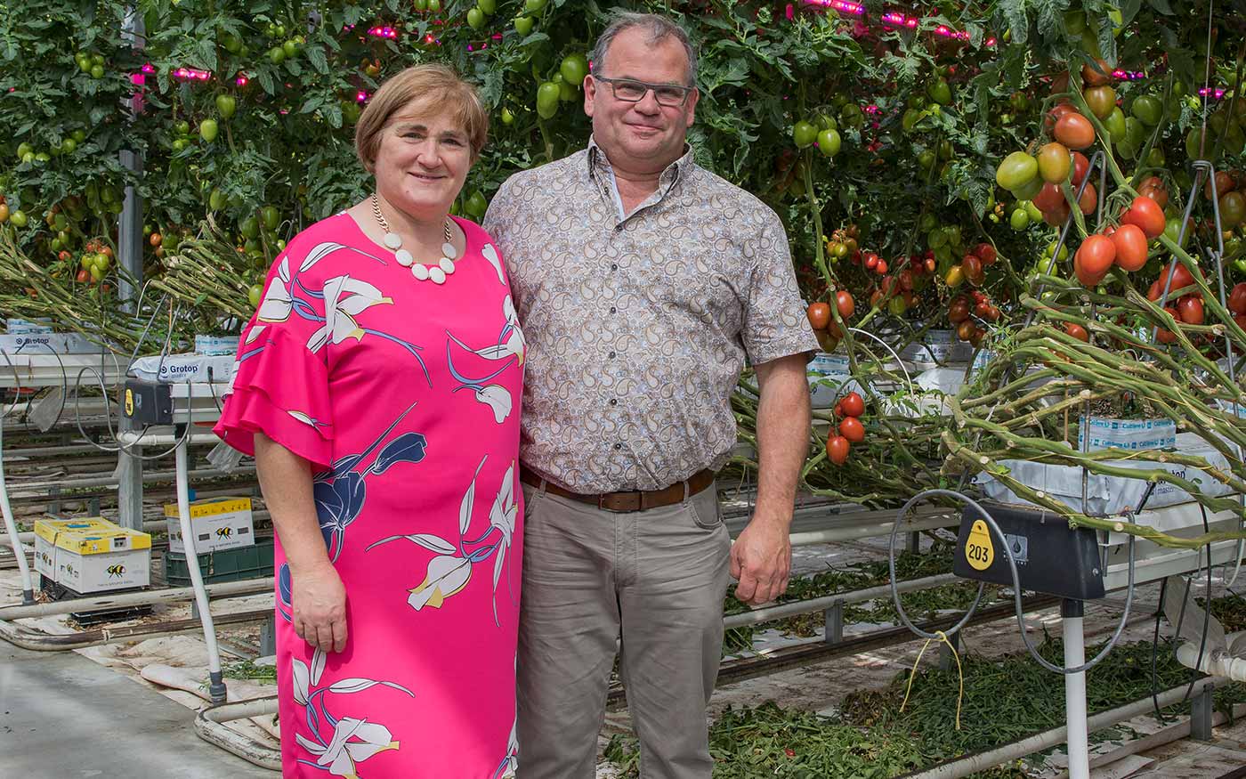 De tomatentelers Leo Verdonck en Marja van Dessel hebben hun belichte tomaten net zoals ieder jaar in september geplant. Het bedrijf had zo’n 75 procent van het gas op dat moment onder goede condities vastgelegd in lange termijncontracten. “En wie verwachtte dat de hoge energieprijzen zo zouden aanhouden?”, vraagt Leo Verdonck zich af. “Het enige wat we vorig jaar gedaan hebben, is een uurtje minder belichten per dag: 17 uur in plaats van 18 uur.”