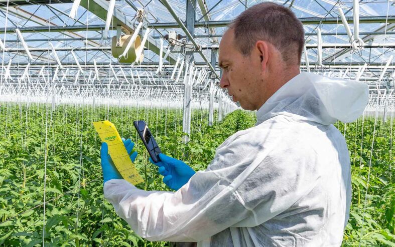 Patrick: “In de tomaten hebben we weinig druk van buitenaf. Wittevlieg en mineervlieg vormen de belangrijkste uitdagingen. Omdat 18 hectare te groot is om zelf te scouten, heb je de mensen in de kas nodig die signaleren. Daarnaast maken we gebruik van de Natutec Scout app van Koppert. Met deze app kunnen de vangplaten middels een mobiele telefoon gescand worden en de wittevliegen geteld en geregistreerd. Omdat het online is, kun je dus als adviseur ook op afstand meekijken en het verloop volgen en indien nodig bijsturen.”