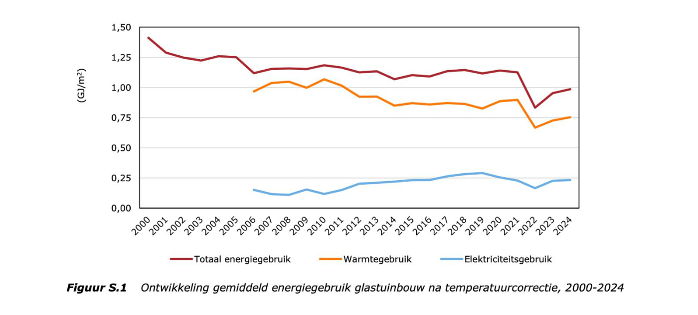 Het totale energieverbruik van de glastuinbouw van bijna 95 PJ, lag in 2024 boven dat van 2023 (+2,6%, +2,4 PJ). De toename is vooral het resultaat van (restanten van) terugveereffecten na het handelen door glastuinbouwbedrijven als reactie op de hoge energieprijzen in de turbulente periode met zeer hoge energieprijzen tussen medio 2021 en begin 2023. Het gemiddelde energieverbruik per m² na temperatuurcorrectie steeg in 2024 met ruim 3% naar 0,99 GJ/m². Door selectieve inzet van energie lag het nog onder het niveau van 1 GJ per m2, waar het in 2022 voor het eerst onder kwam.