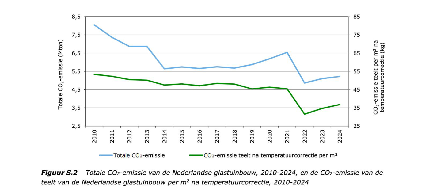 De totale CO₂-emissie van de glastuinbouw nam in 2024 toe naar 5,2 Mton (+0,1 Mton). Wel lag de totale CO₂-emissie hiermee nog onder de niveaus van voor 2022. De CO₂-emissie van de teelt per m² was in 2024 bijna 37 kg CO₂/m², een stijging van +2 kg ten opzichte van 2023. Ook deze toenames kwamen hoofdzakelijk door (restanten) van terugveereffecten na de turbulente periode van zeer hoge energieprijzen.
